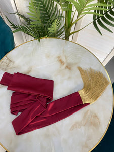 Burgundy satin belt may come with burgundy fringes or golden fringes